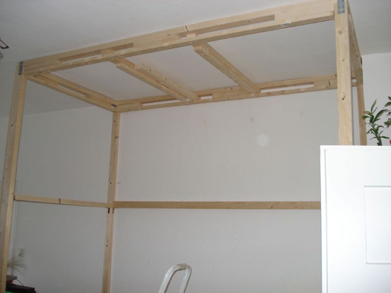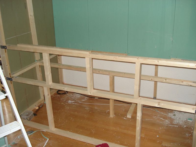 Als erstes sollte ein Grundgestell aufgebaut werden welches aus den 55x50 Kanthölzern besteht. Zusätzlich habe ich die Kanthöltzer im Rückwandbereich mit der Zimmerwand verschraubt sowie an der Zimmerdecke. Da das Terrarium eh zu groß ist, um es mal bei einem Umzug durch die Türen bzw. durch das Treppenhaus zu bekommen geschweige denn es anzuheben. So entsteht quasi ein kleines extra Zimmer für die drei Wasseragamen. Das Grundgestell wird mit Flachmetall und Winkeln zusammengeschraubt (siehe Bild)
