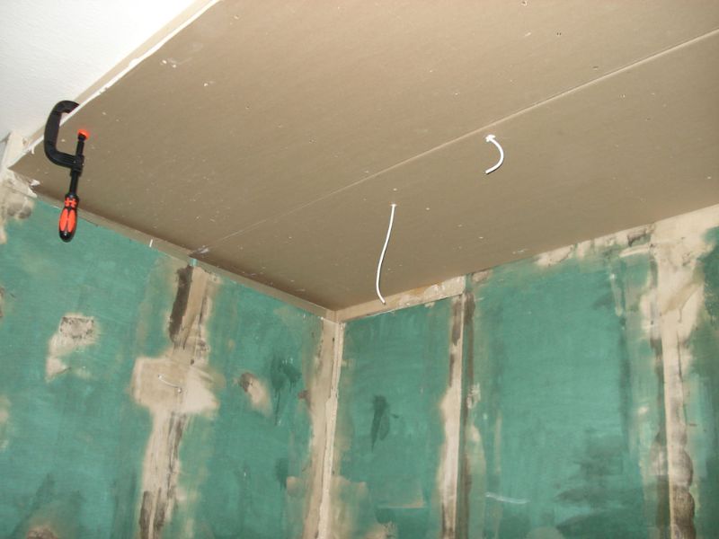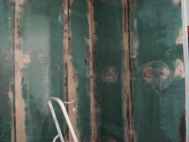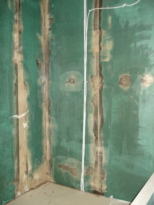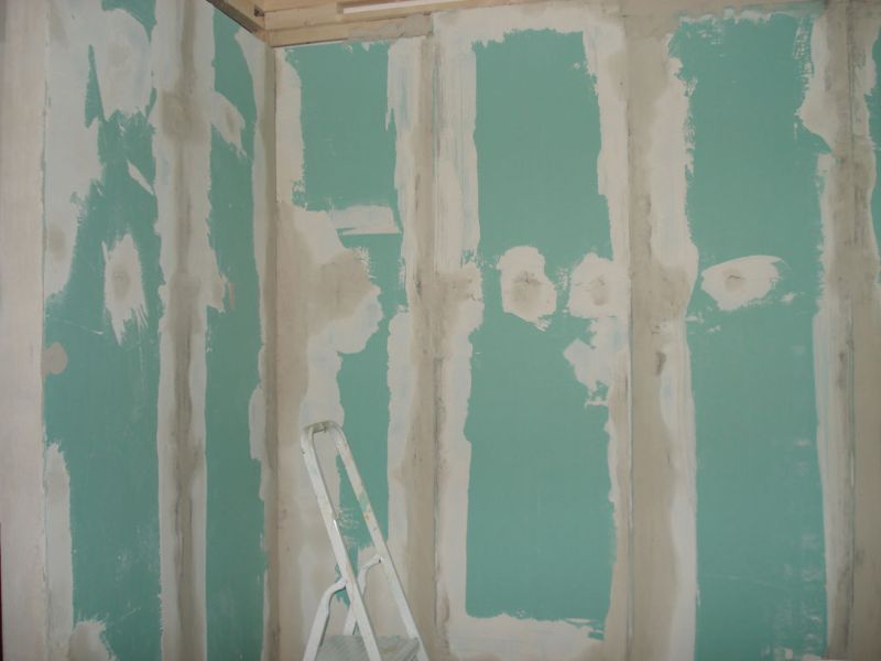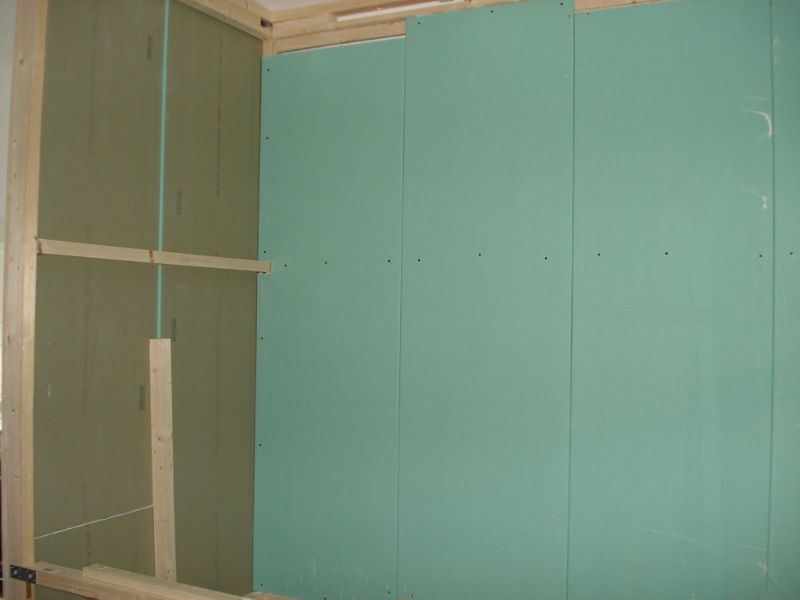 Als nächstes wurden die Außenwände mit Feuchtraumgipsplatten (die Grünen) verkleidet, hier ist darauf zu achten das die Platten nicht an Decke, Wand und Fußboden aufliegen, so dass sie auch arbeiten können.