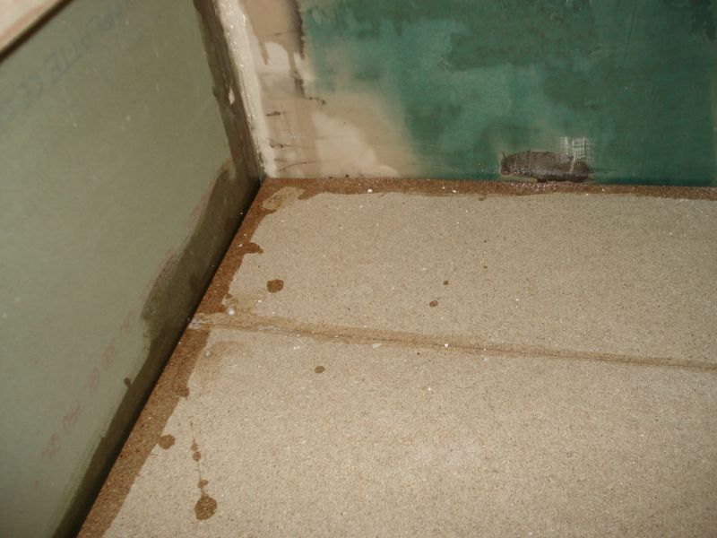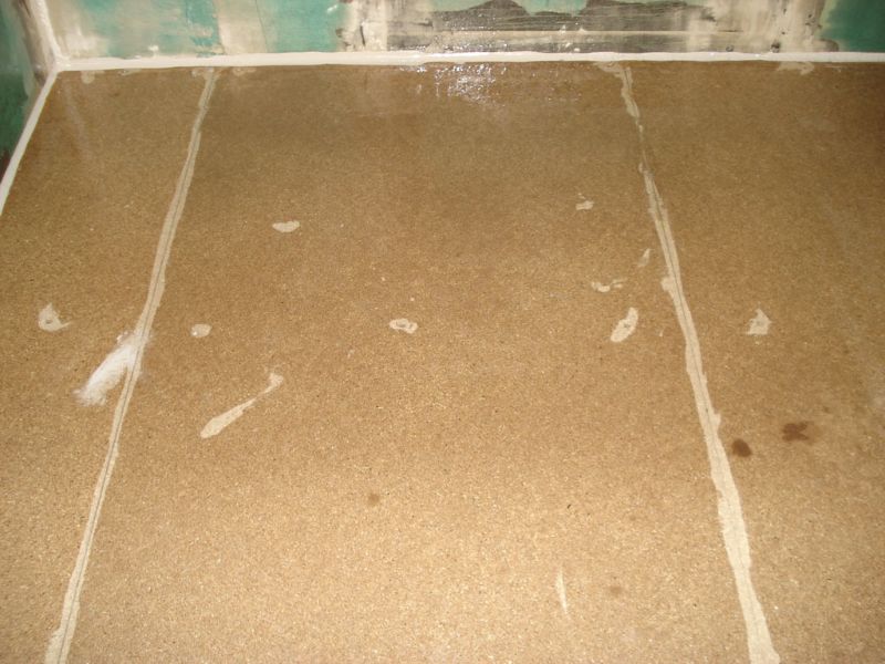Der Flex- Fliesenkleber sollte versucht werden gleichmäßig aufzutragen, bei den Terrassen kann man ruhig die Lücken mit Fliesenkleber füllen. Die erste Schicht braucht ca. 1 Tag zum Trocknen. Insgesamt sollten 2-3 Schichten Flexkleber aufgetragen werden, so das am ende eine Mindestdicke von 3-5mm entsteht. (siehe Bild)