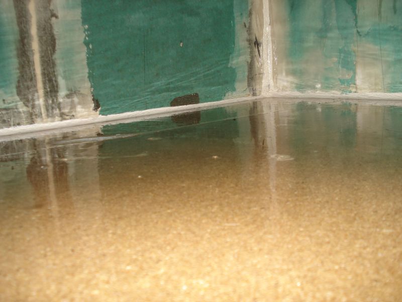 Nach dem nun alles fertig verkleidet war, ging es ans verspachteln der Stöße von den Fechtraumgipsplatten mit Gips. Der Gips braucht ca. einen Tag bis er komplett durch trocknet ist. Nun kann man alle Innenwände mit Epoxid- Harz versiegeln, wenn der Harz noch leicht klebt (nach ca. 3std.) wird eine weitere Schicht aufgetragen. (siehe Bilder oben)