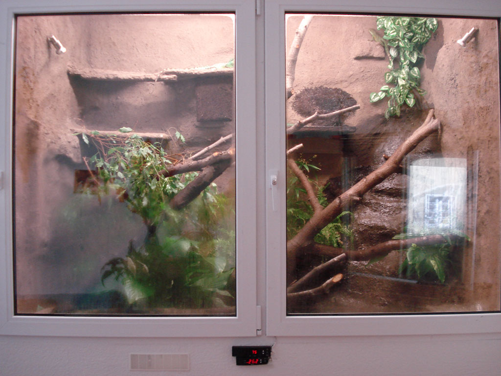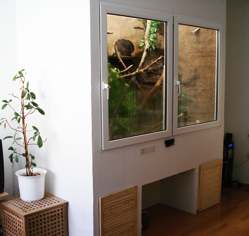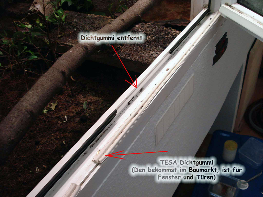 Nun ging es darum die Fenster einzubauen, die Fenster sind gewöhnliche Kunststofffenster mit ISO- Glas je 4mm. Der Vorteil in diesen Fenstern ist das sich nix verzieh, klemmen kann. Kunststoff ist Pflegeleicht. Dann kommt dazu dass es eben ISO- Glas ist was wiederum die Warme- bzw. kalte Luft nicht in das Terrarium lässt. Denn bei normalen VSG- Glas ist der Wärme Verlust am größten, da ja das Glas max. 6mm ist.