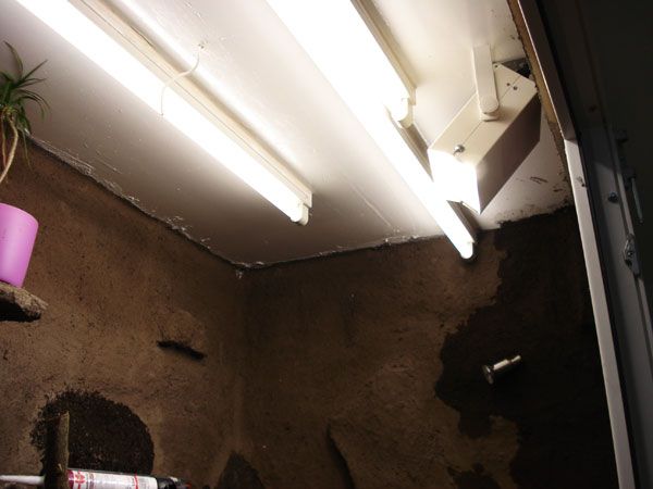 Um das fehlende Licht auszugleichen habe ich ein 70Watt HQI Brenner so installiert das er hauptsächlich mir die Pflanzen im unteren Bereich besser ausleuchtet. Zusätzlich kam noch eine UV- Lampe mit 160W (Power Sun UV) zum Einsatz, ist auch nicht der beste ich weis, aber ich hatte ihn noch vom Aufzucht Terrarium und das Teil kam mal gute 60€! Also warten bis er nicht mehr will. (siehe Bilder)