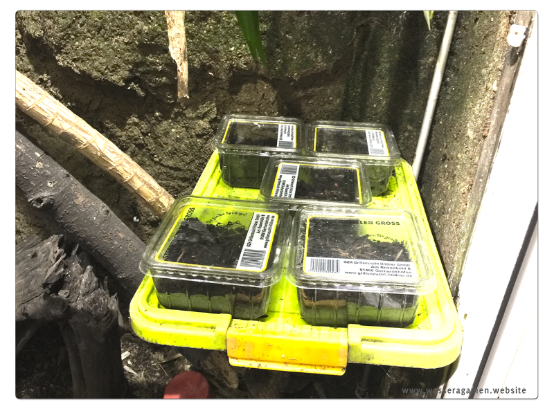 Damit das Substrat nicht das Schimmeln anfängt, sollte man alle 2-3 Tage mal den Deckel öffnen und für ein paar Minuten geöffnet lassen, so das ein Luftaustausch stattfinden kann. Gegebenenfalls kann man das Substrat nochmals befeuchten, denn austrocknen darf es nie! Ich verwende eine alte Fensterputz Sprüchflasche. Das Terrarium ist mit einer Regenanlage ausgestattet, dies würde aber den Samen unkontrolliert in der Heimchenbox aufschwämmen lassen.
